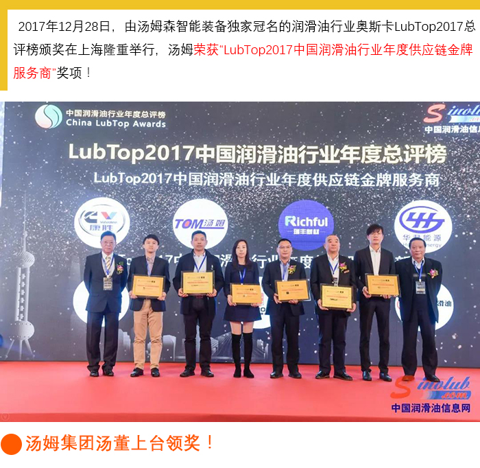 【喜訊】湯姆再次榮獲 LubTop2017中國潤滑油行業年度供應鏈金牌服務商獎!