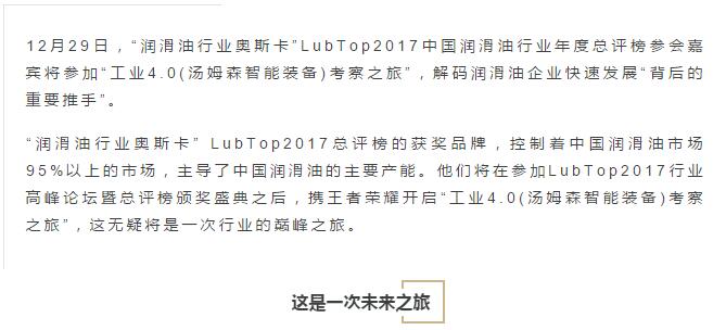 【潤滑油行業(yè)總評榜】江蘇湯姆集團(tuán)獨(dú)家冠名Lubtop2017潤滑油總評榜,與您共登方舟,助您快速駛向工業(yè)4.0!