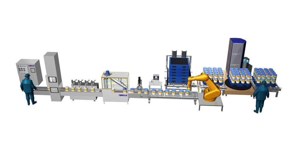 此條生產(chǎn)線設(shè)備配置:上桶機(jī)、全自動(dòng)稱(chēng)重式灌裝機(jī)、全自動(dòng)封蓋機(jī)、噴碼機(jī)、裝箱機(jī)、封箱機(jī)、機(jī)器人碼垛機(jī)/機(jī)械式碼垛機(jī)、自動(dòng)捆扎與纏繞機(jī)。
